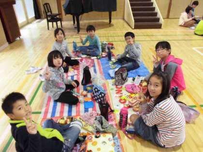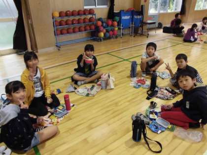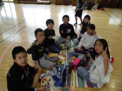 前回と同様、遠足が延期になった3・4年生は、講堂で班別にお弁当を食べました。