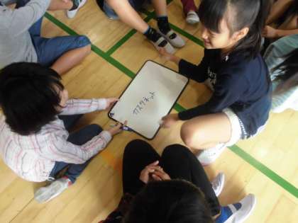 カスタネットやタンバリン、口笛等々いろいろな音を聴き、各グループごとに話し合って答えをホワイトボードに書き込んでいました。
