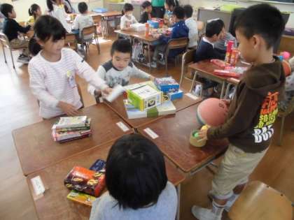 「にている かたちを あつめよう」という学習課題で、家からも持ち寄ってきたいろいろなかたちをしたもののなかま分けをグループごとにしていました。