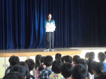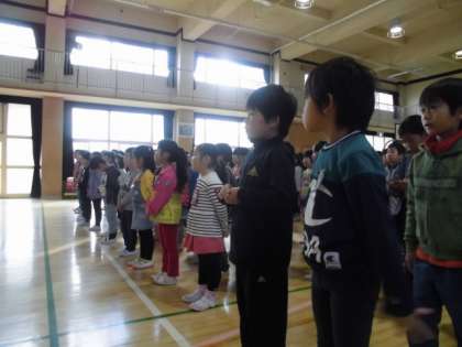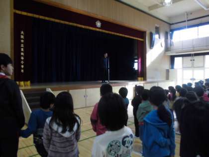 台風一過ということでお天気は回復傾向ですが時折強い風が吹く中、子どもたちは無事登校し、講堂で児童朝会を行いました。