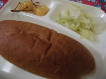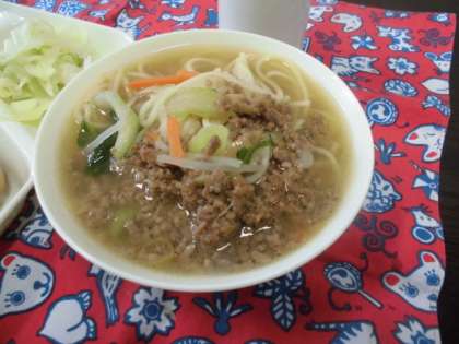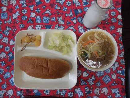 献立は、タンタンめん、キャベツの甘酢づけ、さくらんほ(缶)、パン、牛乳でした。