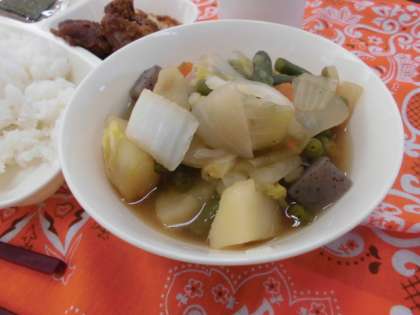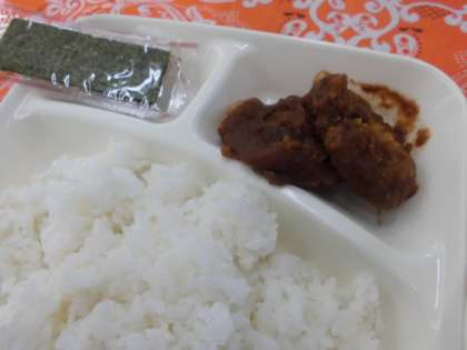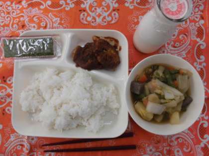 献立は、みそカツ、じゃがいもと野菜の煮物、焼きのり、ごはん、牛乳でした。