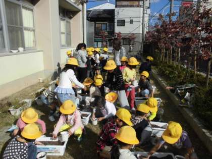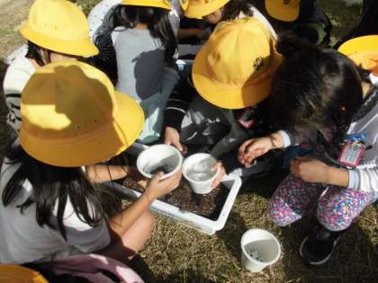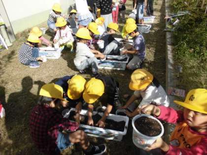 お話の後、校舎南側裏でいただいたチューリップの球根を一人一鉢ずつ植えました。