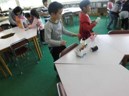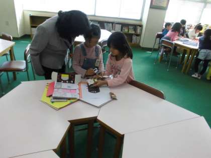 教頭先生からの「図書館・一日・あい・てん・でー」の放送を待ちかねていたように、子どもたちが2時間目終了後の休み時間に図書室へやってきました。