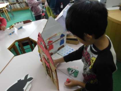 図書館では、図書館補助員の昌山さんが準備してくれていたハロウィンのおもちゃを使って遊んだり、絵本の世界を立体的にしたものを使っていろいろと動かしたりして楽しんでいました。