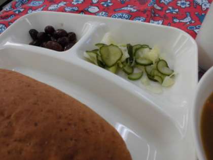 献立は、豚肉と野菜のカレー煮、サワーサラダ、うずら豆のグラッセ、パン、牛乳でした。