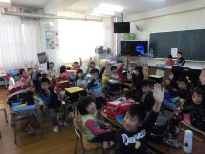 その間1年生は、読書が終わり終わりの会が始まろうとしていました。国語で書くことが好きな人はときくと、多くの子どもが手を挙げていました。