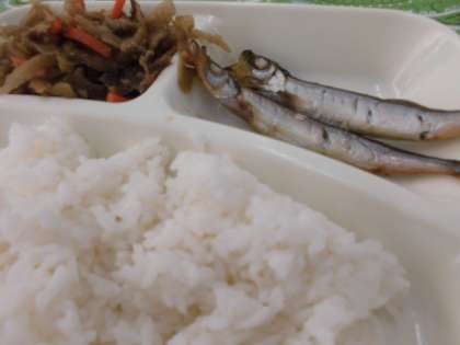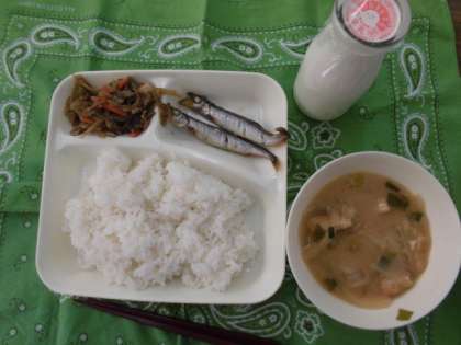 献立は、焼きししゃも、みそ汁、きんぴらごぼう、ごはん、牛乳でした。