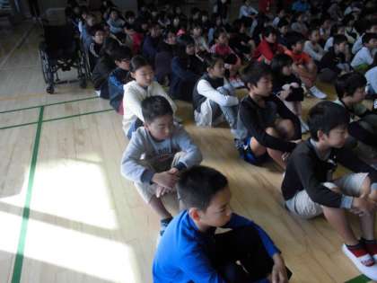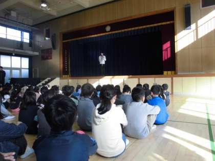 校長からは、よい学校をつくるために「三声」(あいさつの声、朗読する声、歌声)の響く学校にしようということと、19日の学習発表会でこれまで身に付けてきた力を存分に発揮し、いろいろな表現で伝えようという内容の話をしました。