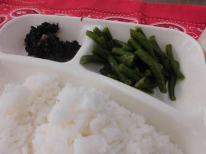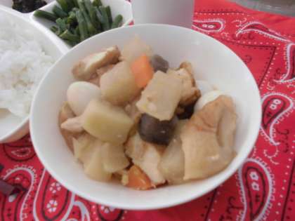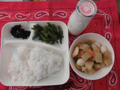 献立は、関東煮、三度豆のからしあえ、のりのつくだ煮、ごはん、牛乳でした。
