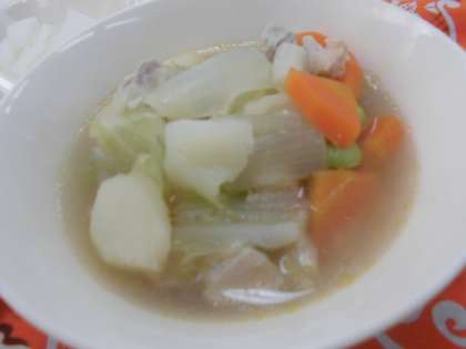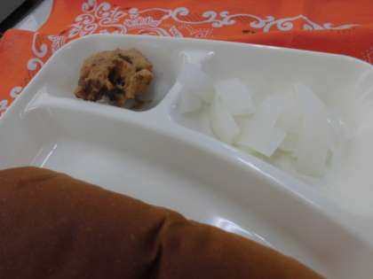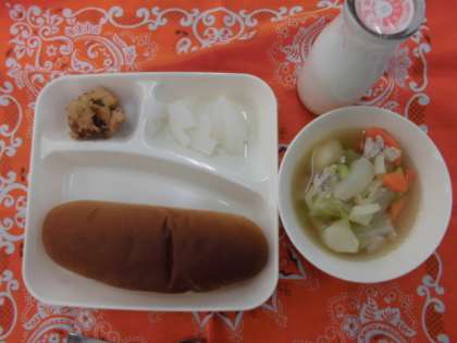 献立は、たこボール、洋風煮、だいこんのピクルス、パン、牛乳でした。