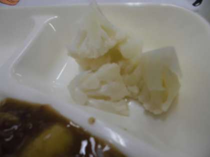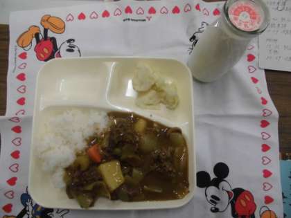 献立は、ビーフカレーライス、カリフラワーのサラダ、豆こんぶ、牛乳でした。