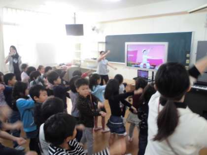 子ども、おかあさん、お父さん、おばあさん、おじいさんのサメが追いかけてくる英語の動画に合わせて、歌いながらふりをつけていました。