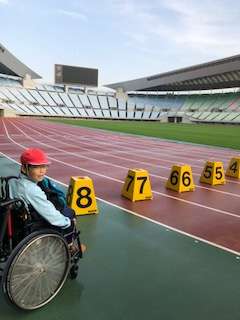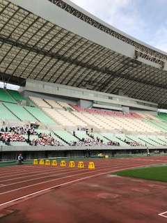 長居スタジアムに到着しました。午前中は、ここで100m走と選抜400mリレーを行います。