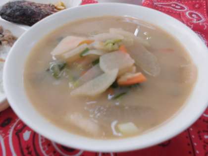 千草焼きは、玉子焼きにささみ、コーン、とうふが入っているようなものです。最後にみつばをちらしてできあがりです。いろいろな具材の味を楽しみながら、とてもおいしくいただきました。