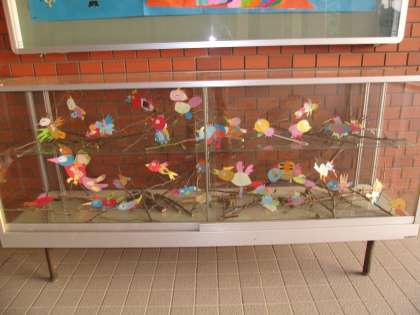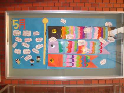 掲示板には、4年生〜6年生の掲示委員会が作ってくれた「こいのぼり」が貼ってあります。1ヵ月ほど前から休憩時間や昼休みの時間を使って少しずつ作っています。ぜひ、力作をご覧ください。下のガラスケースは2年生の作品が入っています。(枝にとまっている小鳥です)