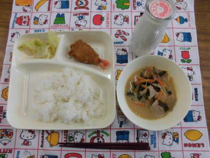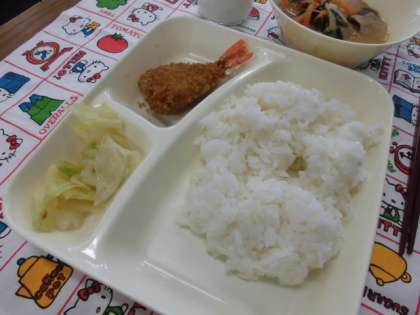 献立は、えびフライ、豚汁、キャベツのかつお梅風味、ごはん、牛乳でした。