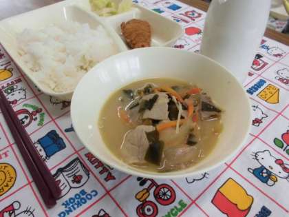 豚汁は、具だくさんです。さつまいも、わかめ、豚肉、にんじん、たまねぎ、白ネギ、えのきだけがつかわれています。わかめが入っているのが今日の豚汁の特徴です。寒くなってきたので、よけいにおいしくいただきました。