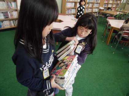 子どもたちは、自分が読みたい本を選ぶだけでなく、休んでいる友だちの分まで借りようとしたり、いろいろなコーナーで楽しんだりしています。
