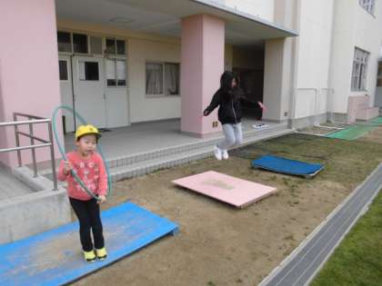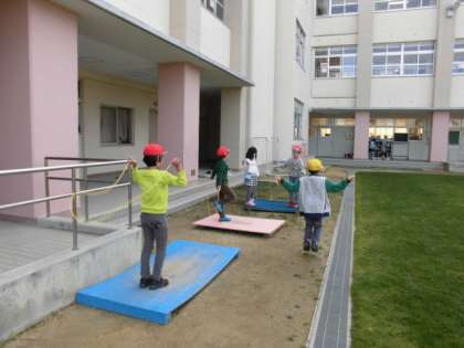 ジャンピングボードやその近くで縄跳びをしている子どもたちです。