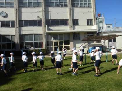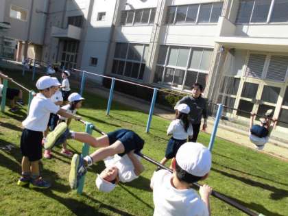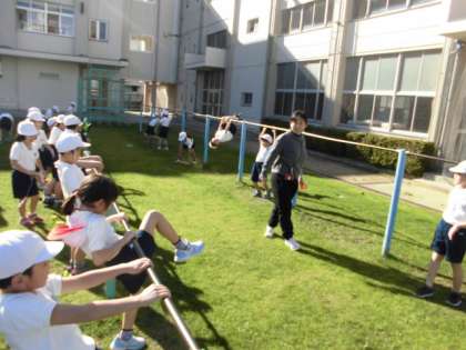 1年生が、体育学習の時間の終わりに鉄棒にチャレンジしていました。