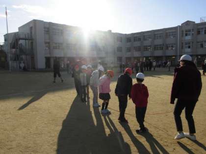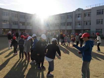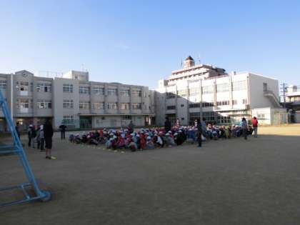 今朝の児童集会は、運動場で各縦割り班ごとに大縄跳の練習をしました。