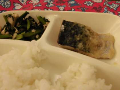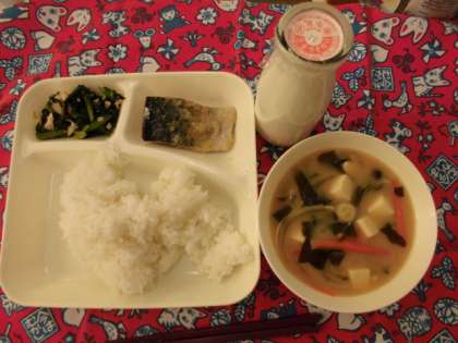 献立は、さばのみぞれかけ、みそ汁、おおさかしろ菜のいためもの、ごはん、牛乳の予定でした。ところが、これまでの天候でおおさかしろ菜が不作で、おおさかしろ菜の代わりに今日は、小松菜がつかわれていました。