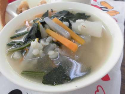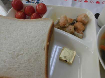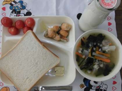 献立は、さけのマリネ、肉だんごと麦のスープ、プチトマト、パン、バター、牛乳でした。