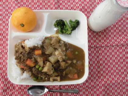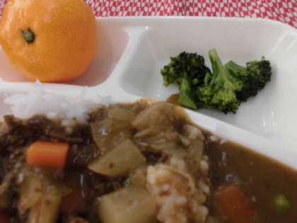 献立は、冬野菜のカレーライス、ブロッコリーのサラダ、みかん、牛乳でした。