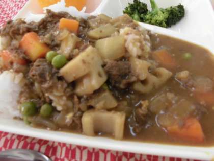 冬野菜のカレーライスの冬野菜は、にんじん、だいこん、レンコンです。ちなみににんじんは、収穫場所で旬の時期が異なります。春から夏にかけては徳島、千葉、青森、長崎県などで、秋は、主に北海道で、冬には千葉県をはじめ長崎、愛知県で収穫されているそうです。旬の野菜は、栄養価が高く、しかもおいしいです。今日のカレーライスも冬野菜の味を楽しみながらとてもおいしくいただきました。