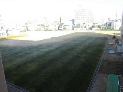 校舎の影が長く伸びて、芝生全面をほぼ蔽っています。