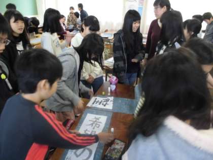 6年生は、書き初め「希望の朝」を台紙に貼っていました。