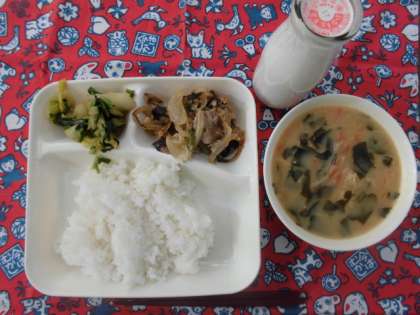 献立は、豚肉のごまだれ焼き、みそ汁、きくなとはくさいのおひたし、ごはん、牛乳でした。