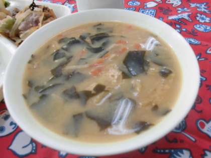 みそ汁は、だしこんぶ、けずりぶしでていねいに出汁をとっていること、赤みそ、白みその合わせみそで味付けをしていることそして具だくさんで、とてもおいしくいただきました。