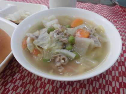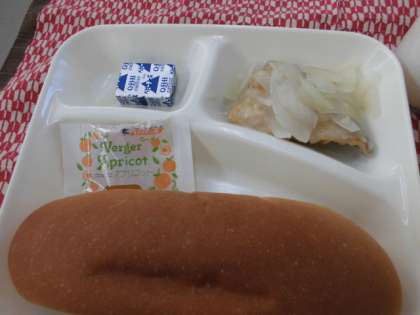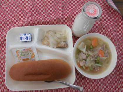 献立は、あじのレモンマリネ、スープ煮、固形チーズ、ジャム、パン、牛乳でした。