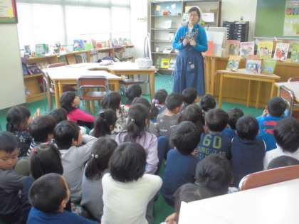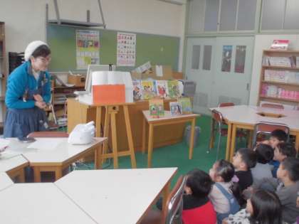 1年生の図書の時間、貸し出し手続きを終え、自由読書をした後は昌山さんのお楽しみコーナーです。