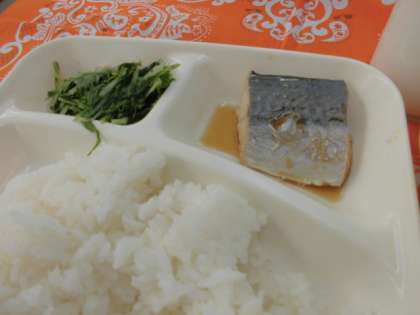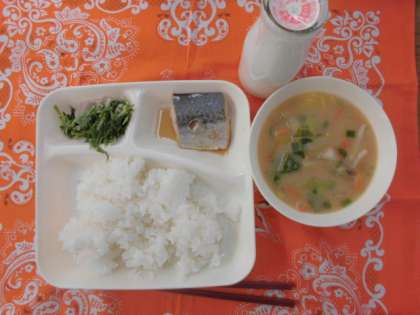 献立は、さごしのしょうゆだれかけ、みそ汁、みずなの煮びたし、ごはん、牛乳でした。