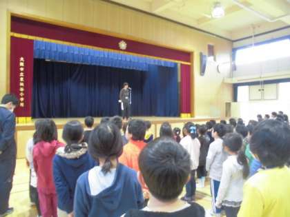 校長からは、土曜授業日に行った森松さんの話について改めて子どもたちに語りました。「たった一つの命」を自分で守る。いろいろな状況を「想像」する。いつ、どこで、起こるかわからない地震にあったときにどう「考え」、どんな「判断」をするか、することの順位を決めて「行動」する「体力」がいること等、「生きていく力」について改めて話しました。