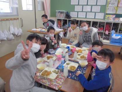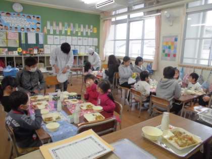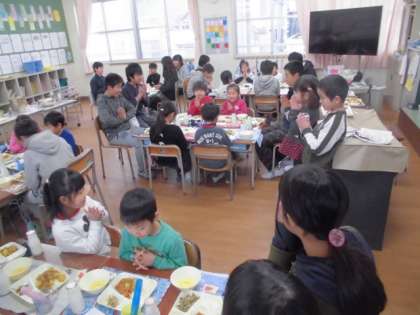 配膳をしている様子です。雰囲気は、盛り上がっています。