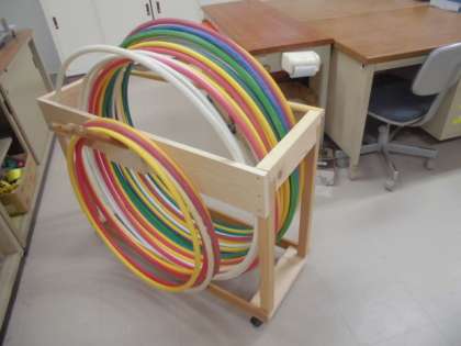 大きさの違う体操の輪を収納する物を管理作業員が手作りしました。