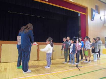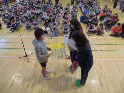 各学年児童からいつもおいしい給食を作ってくれる給食調理員へ日頃の感謝の気持ちも込めて感謝状を手渡しました。