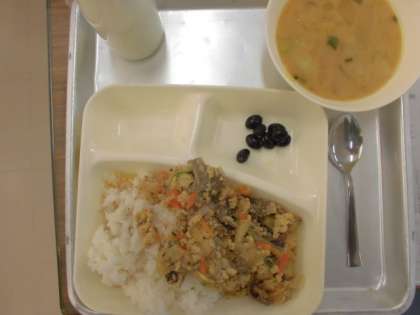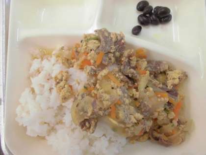 献立は、他人丼、みそ汁、黒豆の煮物、牛乳でした。