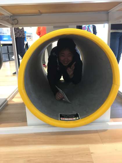 館内では、地震が起こった後のガスの復旧の仕方を学んだり、作業車に乗ったり、実際のガス管と同じ管の中を通り抜けたりしました。