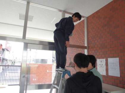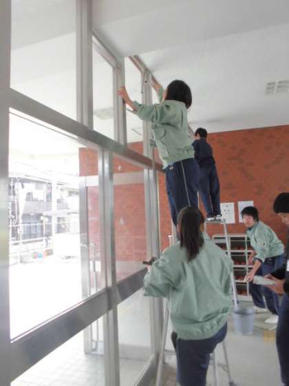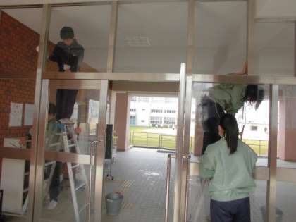 玄関の大きなガラスをきれいに拭く作業も経験してもらいました。