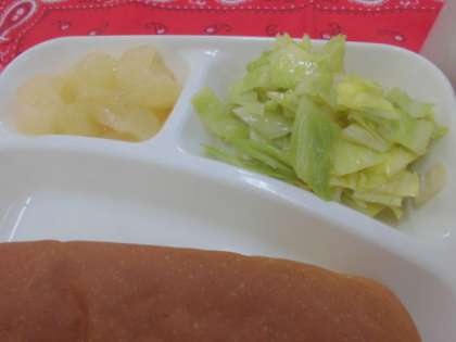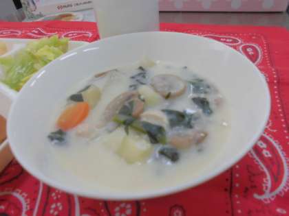 献立は、ほうれん草のクリームシチュー、キャベツのサラダ、洋ナシ(カット缶)、パン、牛乳でした。