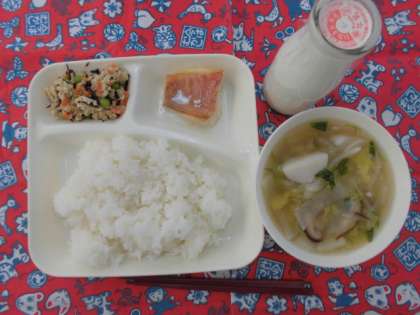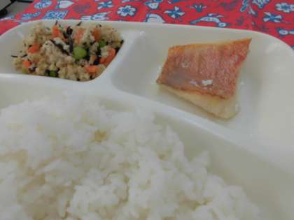 献立は、赤魚のレモンじょうゆかけ、うすくず汁、高野どうふの炒り煮、ごはん、牛乳でした。