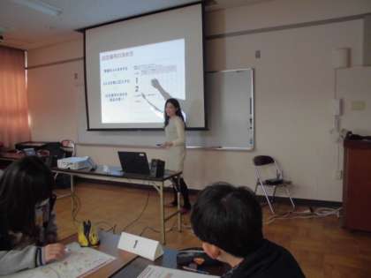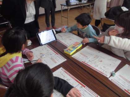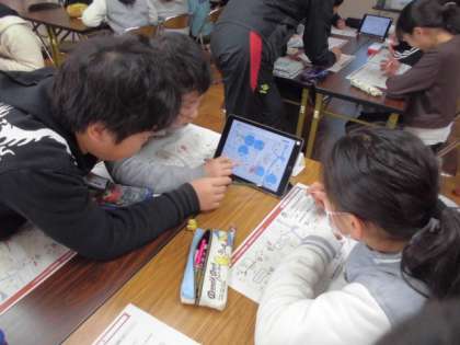 コンビニエンスストア出店に向けての様々な情報が入力されているタブレットをかこみながら、班ごとに各自の考えを発表しあったり、必要な情報をタブレットから得たりして話し合いが熱を帯びてきました。