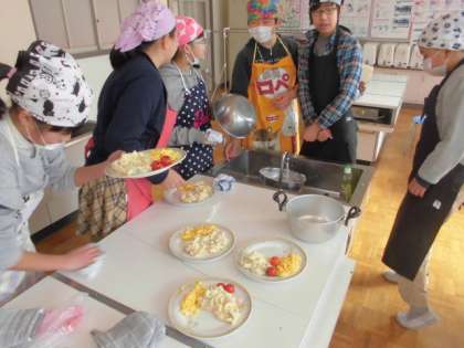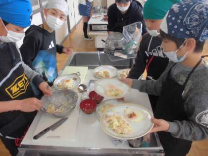 調理を終えたらすぐに食器やフライパン、鍋などを洗ったり、食卓を整えたりしていました。チームワークも良く、手際よく活動していました。
