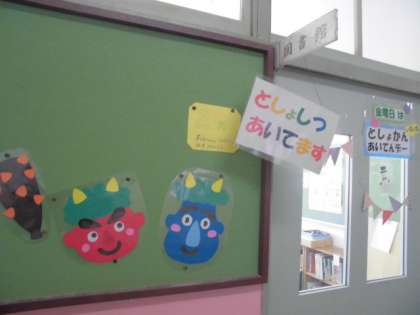 休み時間が終わったら、各学年ごとに図書館へ来て本の貸し出し手続きや自由読書、昌山さんからの読み聞かせ等があります。