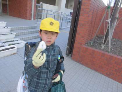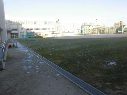 昨日降った雪が、芝生や運動場の隅に残っていました。